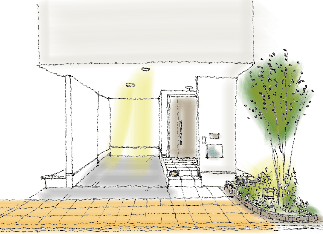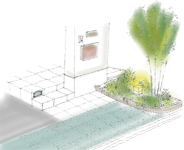 建物を後退させ、アプローチ空間にゆとりをもたせる計画。植栽は高さの違うものを