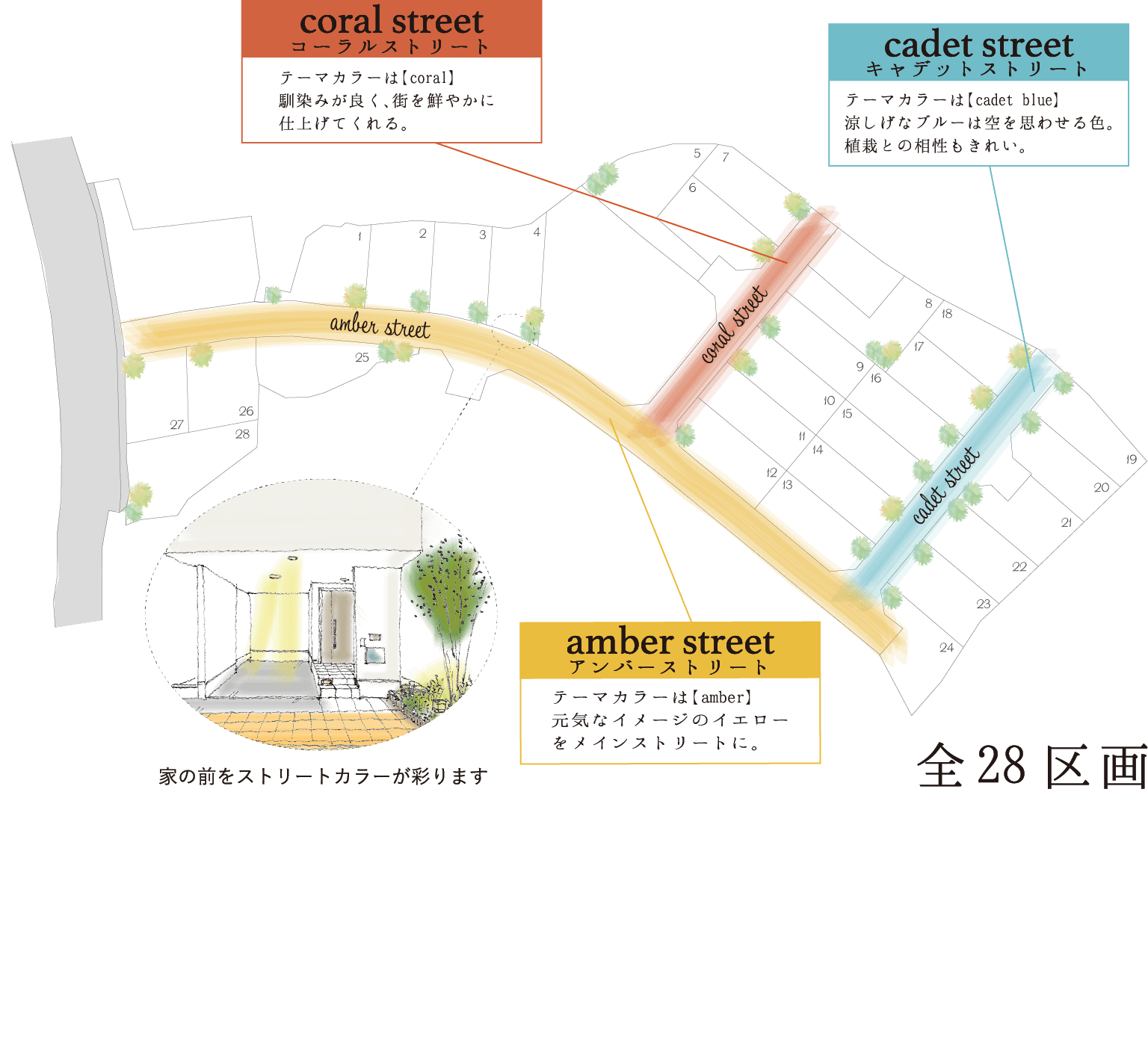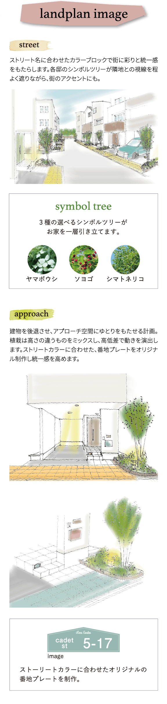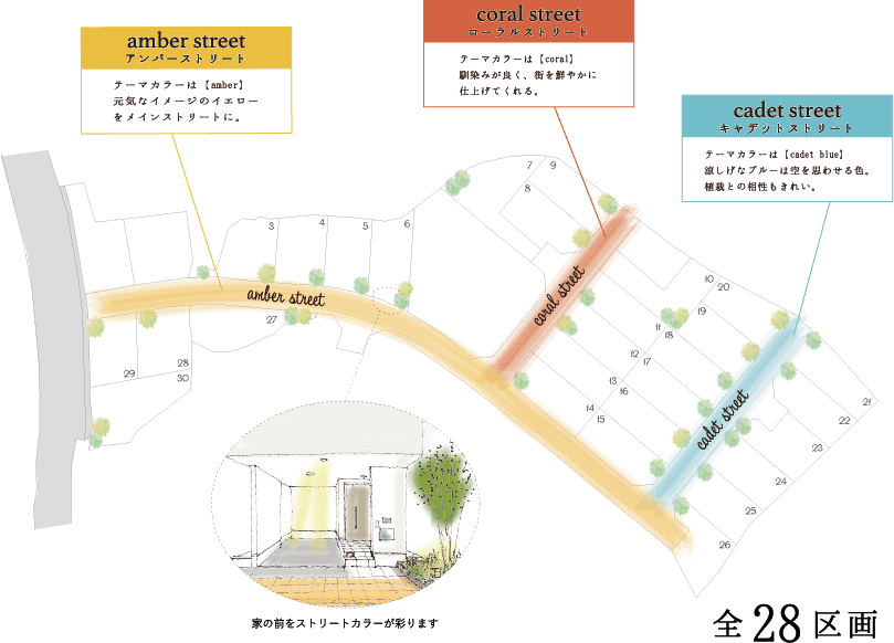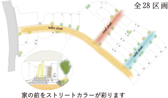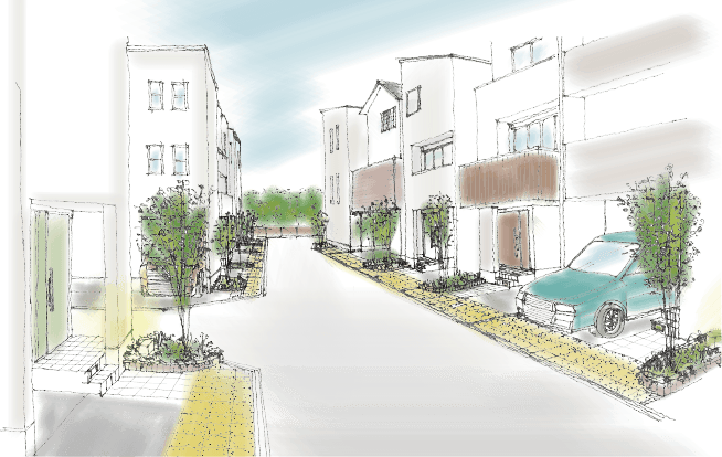 各邸のシンボルツリーが隣地との視線を程よく遮りながら、街のアクセントにも。